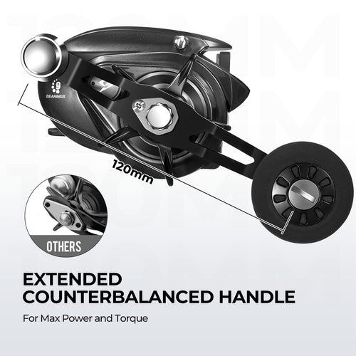 • The effort-saving balanced rocker arm: It features an extended balanced handle, measuring 120mm in length, which provides the optimal leverage ratio and maximum torque. Made of high-strength aluminum alloy and equipped with a large EVA knob, it offers a greater leverage effect during battles with large fish, making it easier for anglers to handle and exert control.