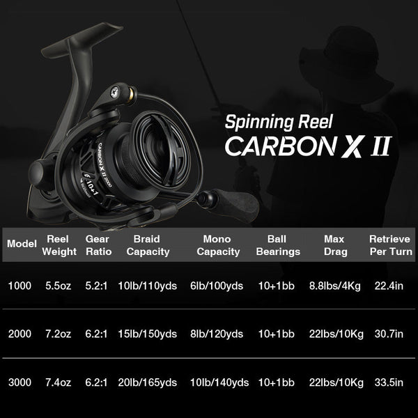 • 【Upgrade Spinning Reels】- The Carbon X II is meticulously crafted with an all carbon fiber body, rotor and side plate making it one of the lightest in its class, weighing in at a mere 7.2 oz in 1000 model. Compared with the Carbon X, the upgrade Spinning Reel is lighter and more smooth, this lightweight power house is perfect for battling big fish!